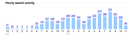 These 5 sites did not surprise me, but Google’s ability to record my web usage did. Even more impressive was the way in which data on my usage was presented. Below is a graph of my hourly search activity over the last month.