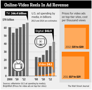 1) Contraction Force: The average price per video ad is decreasing. In 2011 at top tier sites ads were in the $17-$25 range. In 2012 that range fell to $15-$20. The WSJ argued that this price will only decrease further from here.