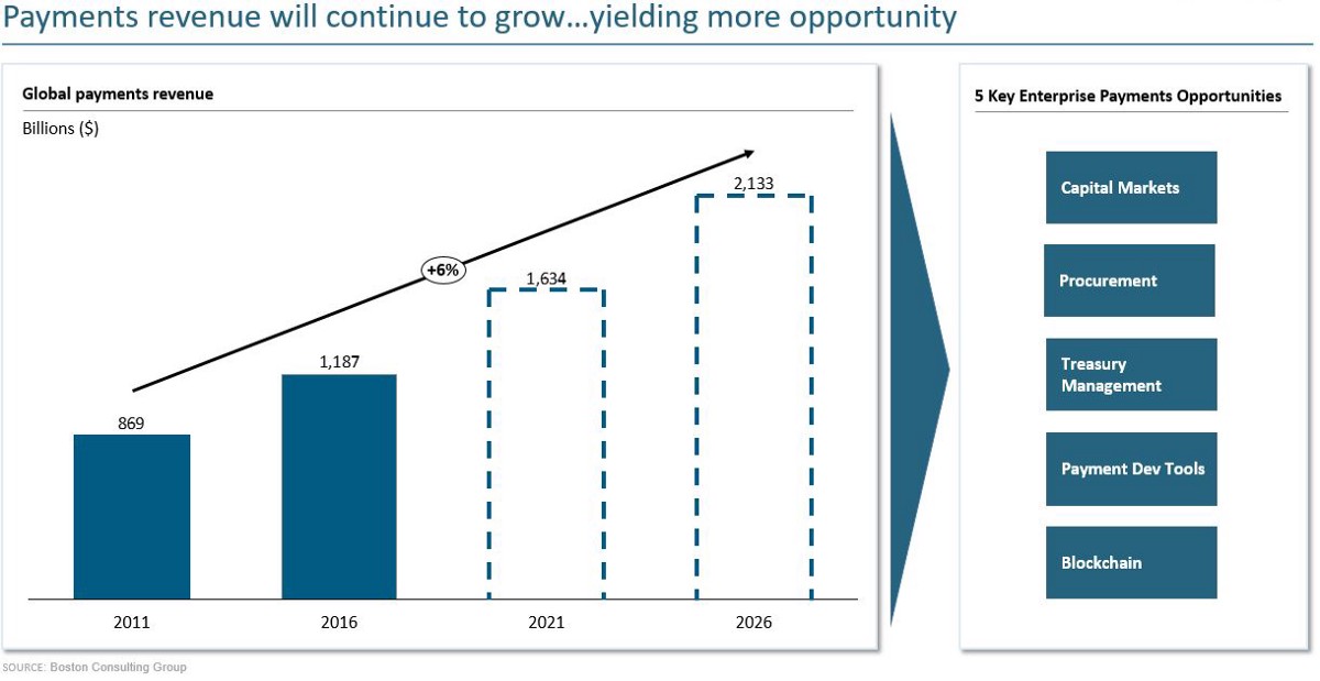 While these challenges are daunting (they most certainly are not for the faint of heart!), the good news for new entrants is that the banks and other FIs are unlikely to be the ones to fix enterprise payments. We believe FinTech startups are best positioned to make progress here, bottoms-up. More specifically, there is an enormous opportunity to capture value in enterprise payments($2.1T in payment revenue by 2026) across 5 specific subcategories: (1) capital markets, (2) procurement, (3) treasury management, (4) payment dev-tools and (5) blockchain.