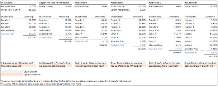 Obviously, every situation is unique and your mileage may vary. But this is a close enough proxy to what happens to a lot of startups in practice. Here is what the available option pool will look like over time across rounds: