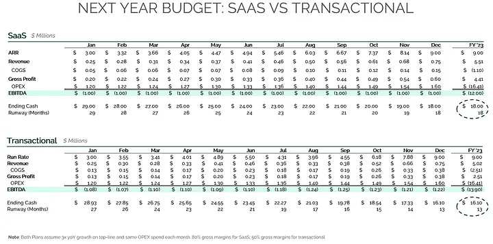 Let’s take two growth-stage Series B companies that want to 3x growth from ’22 to ’23. The SaaS business wants to go from 3M of ARR to 9M of ARR and the transactional business wants to go from 3M of revenue run-rate to 9M of revenue run-rate — enviable growth for any Series B company! (Please note there is a key distinction between “ARR” and “run rate,” see here.) The ’23 top-line plans of the two businesses could well look something like this:
