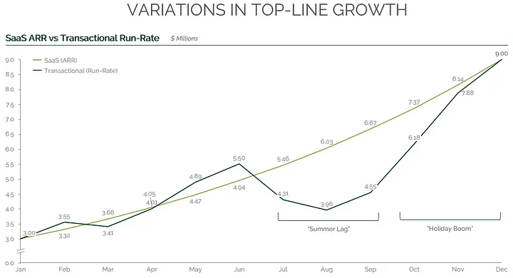 Transactional businesses have a variety of nuances that make them more challenging to budget for vs a business with a SaaS model. The first, and most obvious difference, is that planning out the top-line on a month-to-month basis for the transactional business is inherently harder.