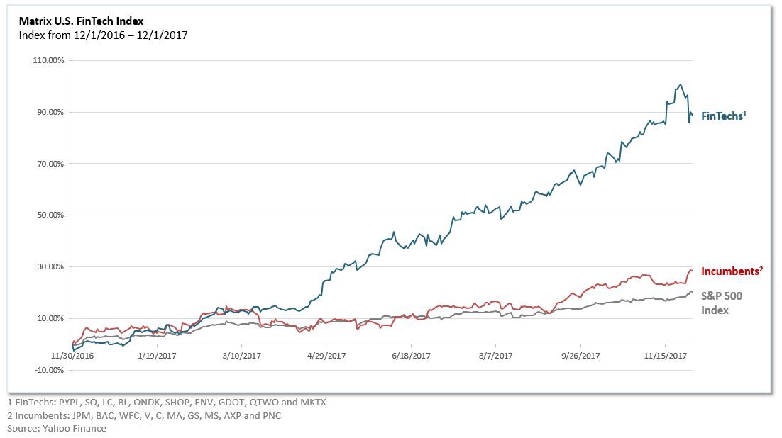 As seen below, the Matrix FinTech Index shows a clear win for the FinTechs, who have collectively delivered 89% returns in the last 12 months. This is 60 percentage points higher than the 29% returns delivered by the incumbent portfolio and well above the S&P 500 Index.