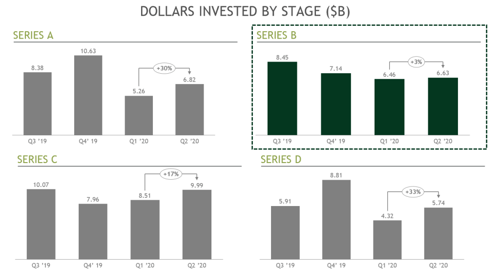 The Series B round, however, while declining in a more measured way, continued a several quarter decline with almost no recovery from Q1 ’20 to Q2 ’20.