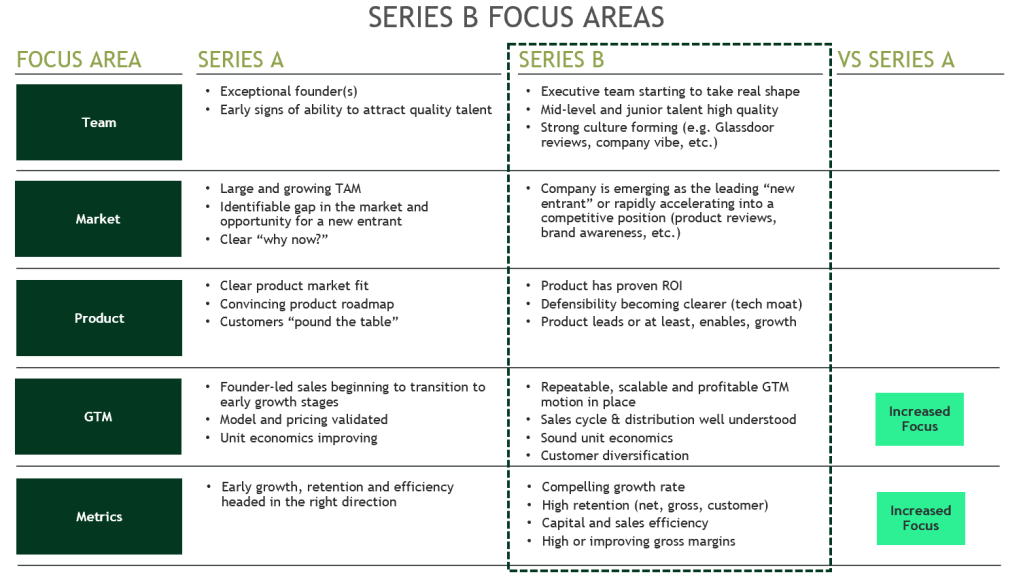 The best way to frame the Series B and how investors will evaluate your company is through the lens of “building on the A.” Most investors, generally speaking, focus on five key areas: (1) team, (2) market, (3) product, (4) GTM and (5) metrics. The first 3 have some additional features that build on what was established at the Series A while the latter two have a materially increased focus vs the Series A.