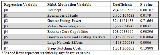 There are several characteristics of the regression worth pointing out. First, the intercept (β0) is negative, which limits the full application of the regression equation. This is likely due to a small sample size and data that is not normally distributed. Because of this negative intercept, we cannot make a direct dollar connection between each M&A motivation variable and the premium paid by the acquiring firm. That being said, we can make some relative observations based on the size of each beta coefficient. Additionally we can make some important observations regarding statistical significance. As seen in the exhibit above the four M&A motivation variables that were statistically significant include: economies of scale, value chain integration, growth in new and existing markets and large network effects. The remaining three variables are not statistically significant according to our model.